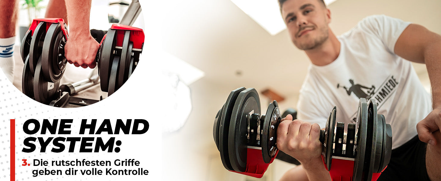 Revolutionär: Schluss mit zeitraubenden Anpassungen und überfüllten Homegyms! Unsere SPORTSCHMIEDE Kurzhanteln vereinen 12 Gewichte in einem Gerät – das spart nicht nur Platz, sondern auch Geld. Egal, ob du Anfänger oder Fortgeschrittener bist, mit diesen Hanteln hast du immer das richtige Gewicht zur Hand, um dein Training uneingeschränkt zu gestalten.